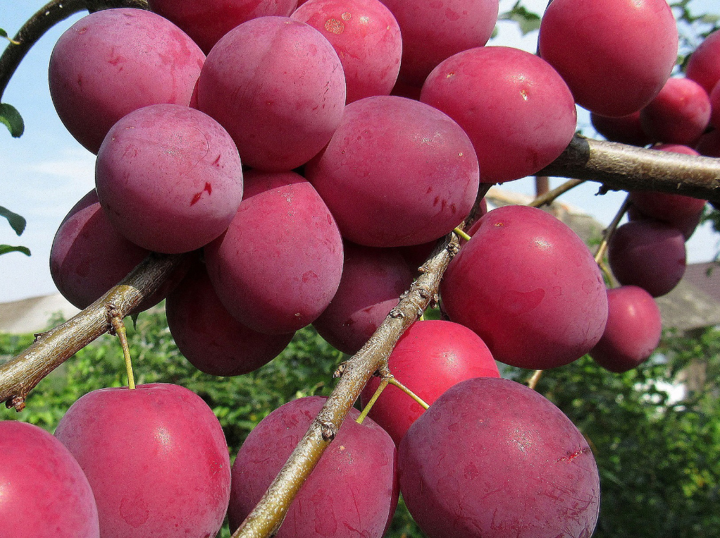 Плоды — восторг: Крупные, нарядные. Мякоть желтая, волокнистая, очень сочная. Вкус гармоничный, кисло-сладкий, десертный. Косточка отделяется плохо (это единственная особенность, с которой нужно смириться). Плоды долго не осыпаются после созревания и отлично транспортируются, если снять их чуть недозрелыми. Идеальна для еды свежей и для компотов (они получаются как из персика или абрикоса).