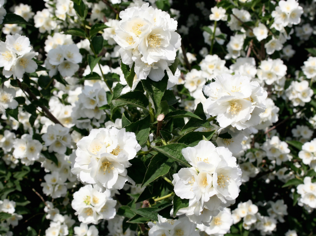 Цветы: Чистейшего кипенно-белого цвета. Они не самые крупные (около 3-4 см в диаметре), но их очень много. Форма цветка — полумахровая или махровая, с изящными, слегка подвернутыми лепестками.