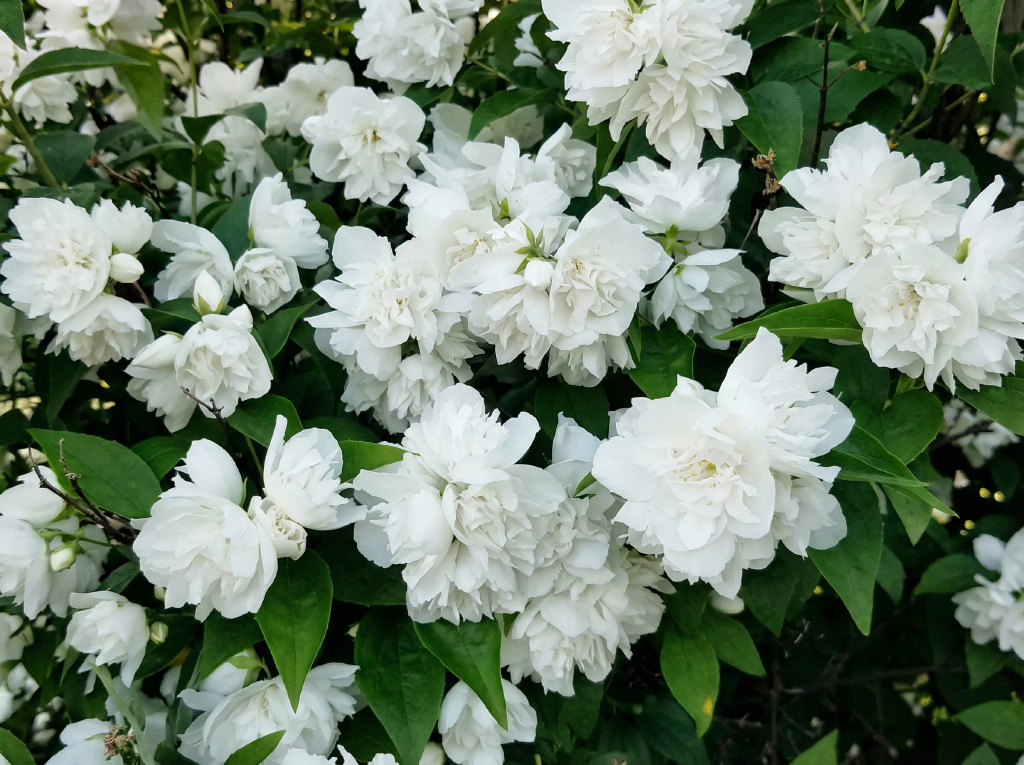 Главная особенность — уникальные «розочки»: В период цветения этот чубушник выглядит совершенно иначе, чем привычные «жасмины».