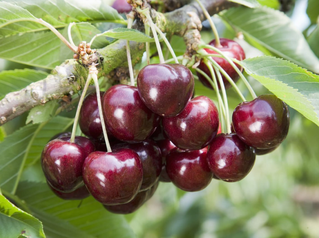 Плоды — украшение сада: Ягоды крупные, округло-плоские. В период созревания дерево выглядит очень эффектно, усыпанное яркими плодами. Мякоть красная, очень нежная и сочная, сок красный. Вкус отличный, в нем сладость черешни удачно дополнена легкой, приятной вишневой кислинкой, что делает его очень «питком» и освежающим. Прекрасен в свежем виде и в компотах.