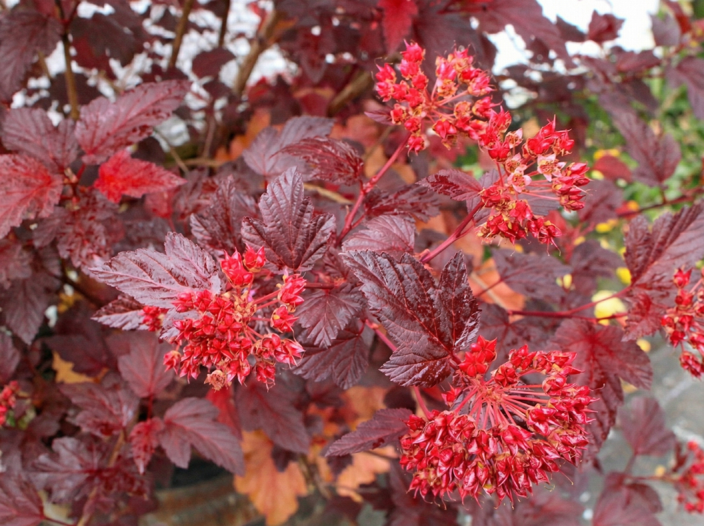 Плоды: К осени созревают декоративные плоды-листовки, которые приобретают красно-коричневый цвет и украшают куст даже зимой. У взрослых растений декоративна также отслаивающаяся полосками кора на старых побегах.
