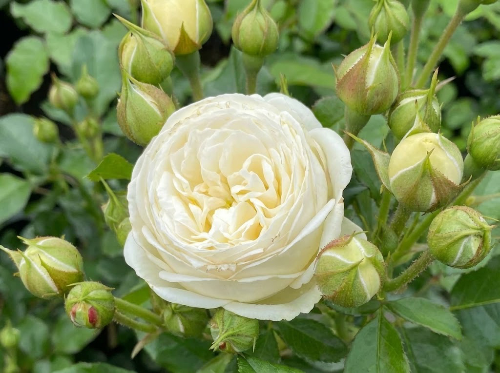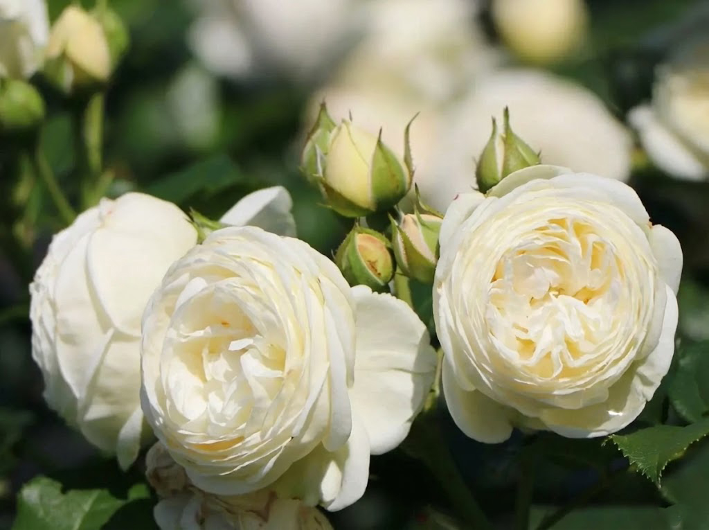 Цветки густомахровые, ностальгической чашевидной формы, собранные в пышные, округлые соцветия. Окрас — чистый, кремово-белый с самой сердцевиной нежного сливочного или легкого абрикосового оттенка, что придает цветку объем и глубину.