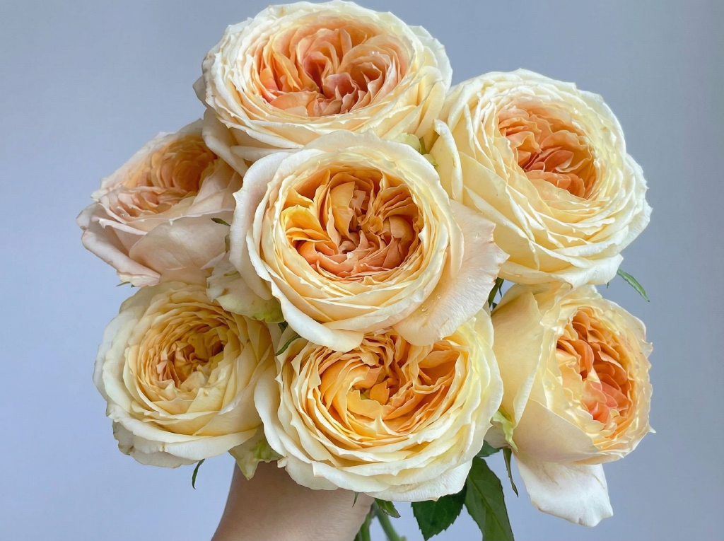 Цветки густомахровые, ностальгической формы, с лепестками нежного персиково-абрикосового цвета с кремовыми и карамельными оттенками. Бутоны классической формы, раскрываются в пышные розетки диаметром 8-10 см. Окрас особенно красив в полном роспуске, когда проявляются все оттенки карамельной палитры.