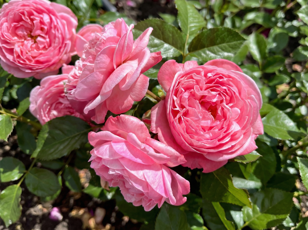 Цветки густомахровые (от 45 до 60 лепестков), ностальгической формы — от шаровидной до розетковидной . Окрас ярко-розовый с тонкими переходами в персиковые и абрикосовые тона, что создает эффект мерцания и подсветки изнутри . Диаметр цветка 8-10 см, они собраны в крупные соцветия по 3-5 штук на стебле .