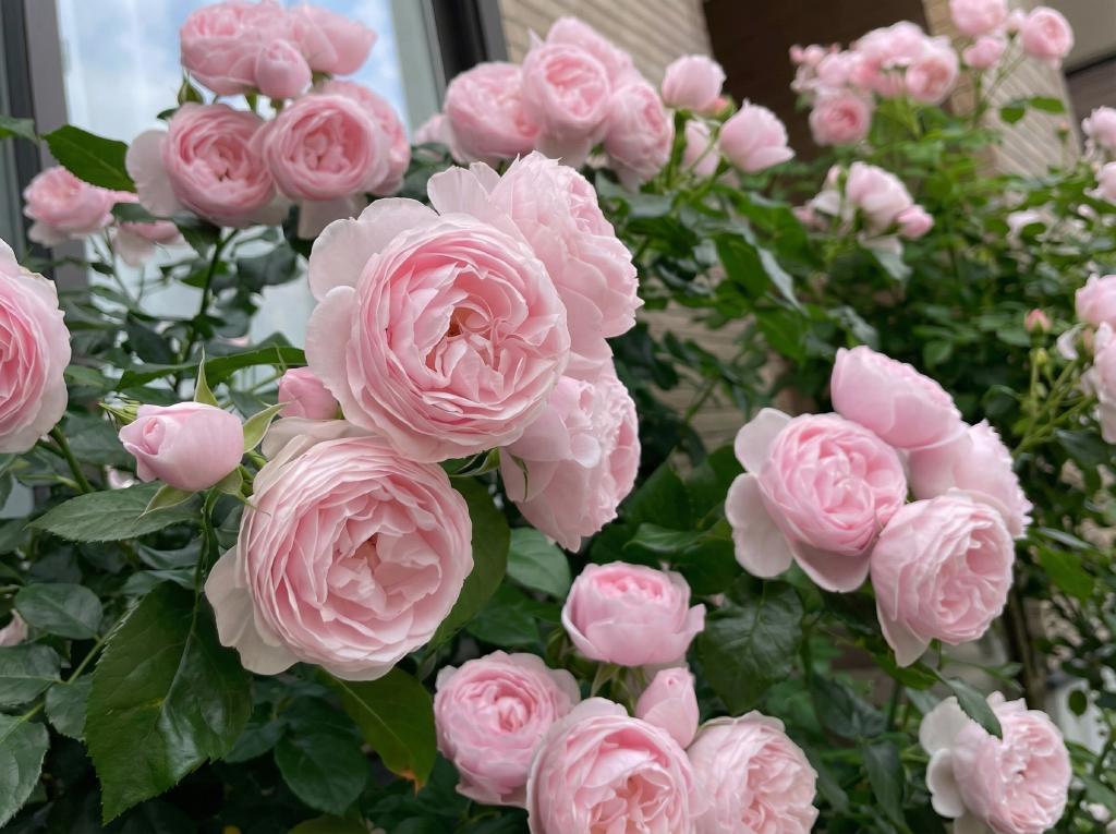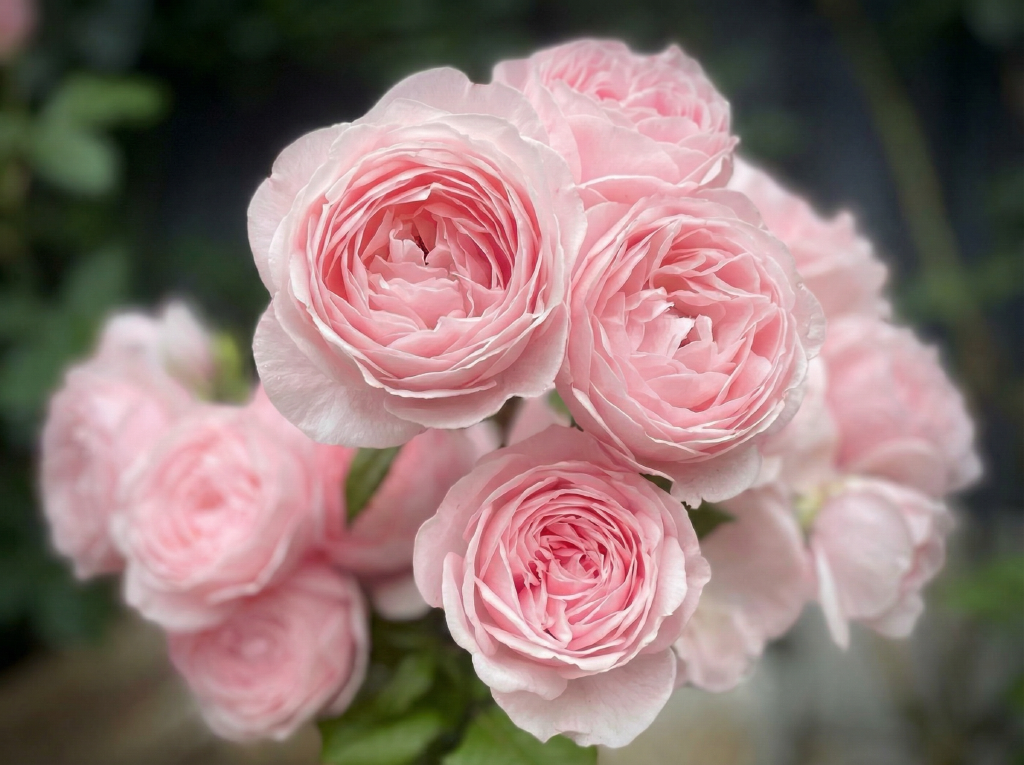 Цветки густомахровые (до 75 лепестков), ностальгической квартированной формы, напоминающей старинные розы. Окрас — нежно-розовый, пастельный, иногда с перламутровым или абрикосовым подтоном. Цветки собраны в пышные кисти по 3-7 штук, создавая эффектные тяжелые гроздья.