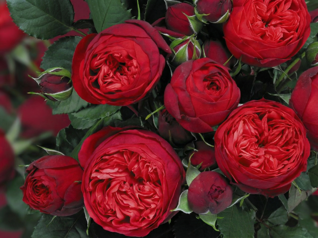 Густомахровые цветы с более чем 100 лепестками образуют идеально круглые, куполообразные бутоны диаметром 8-10 см. Окрас — насыщенный тёмно-красный с бархатистым отливом. По мере роспуска цветок сохраняет свою совершенную форму, лишь немного раскрываясь в пышную розетку.