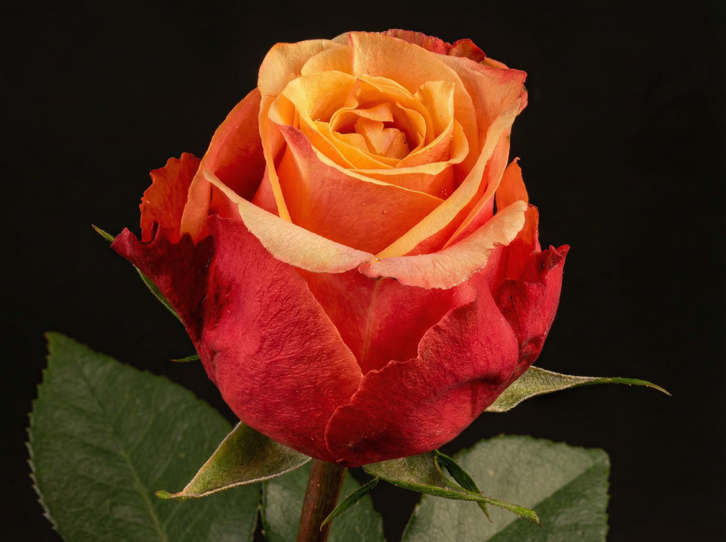 Классический бокаловидный бутон раскрывается в махровый цветок с волнистыми лепестками. Внутренняя сторона лепестков окрашена в теплый вишнево-красный цвет, в то время как внешняя сторона имеет нежный золотисто-кремовый оттенок. Этот контраст создает потрясающий эффект градиента.