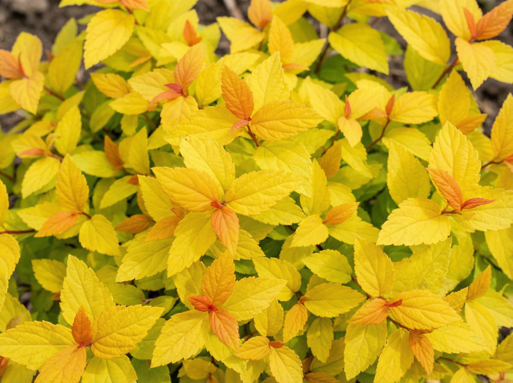 Весна: Куст просыпается очень рано, выпуская яркие, насыщенные золотисто-желтые листочки с легким красноватым оттенком на кончиках.