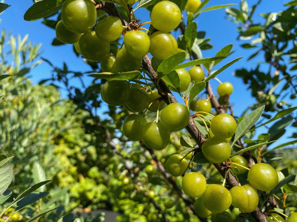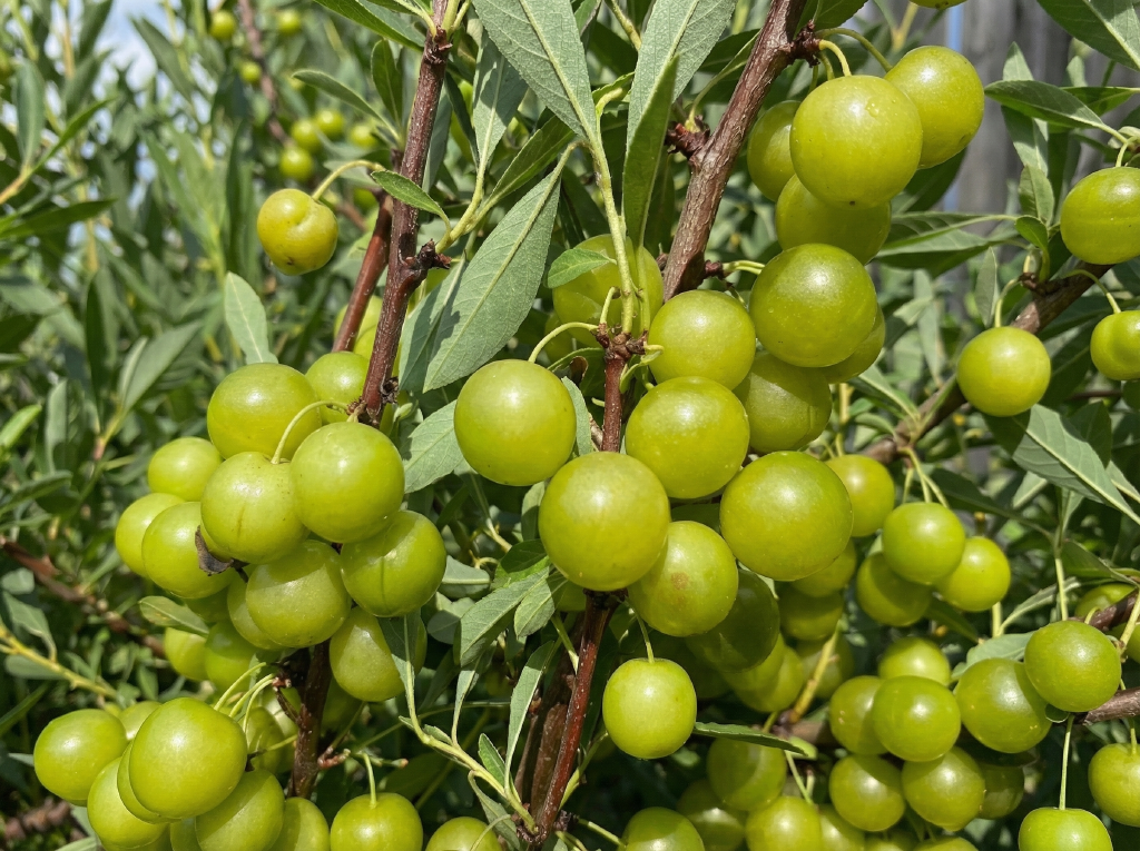 Плоды: В отличие от большинства темноплодных гибридов, здесь ягоды светлые, желто-зеленые. Мякоть сочная, косточка отделяется неплохо. Вкус гармоничный, освежающий, без сильной терпкости.