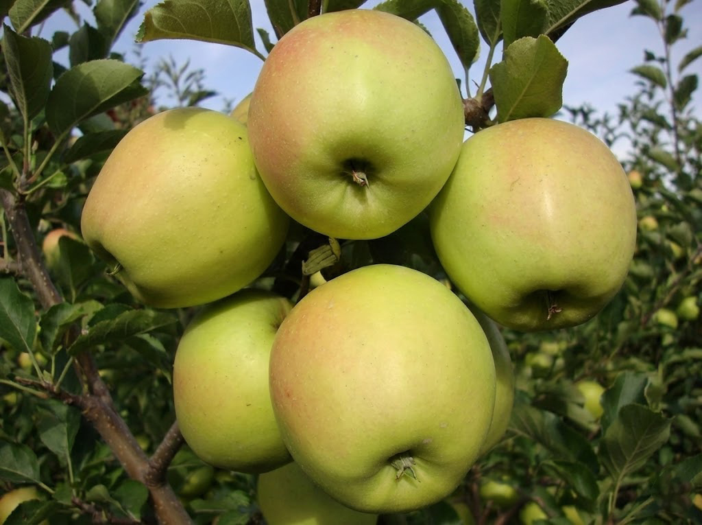 Плоды округлые, зеленовато-желтые, иногда с легким румянцем. Мякоть белая, плотная, мелкозернистая и очень сочная. Важно: Снимают яблоки в конце сентября твердыми, потребительская зрелость (полный вкус и мягкость) наступает через месяц хранения.